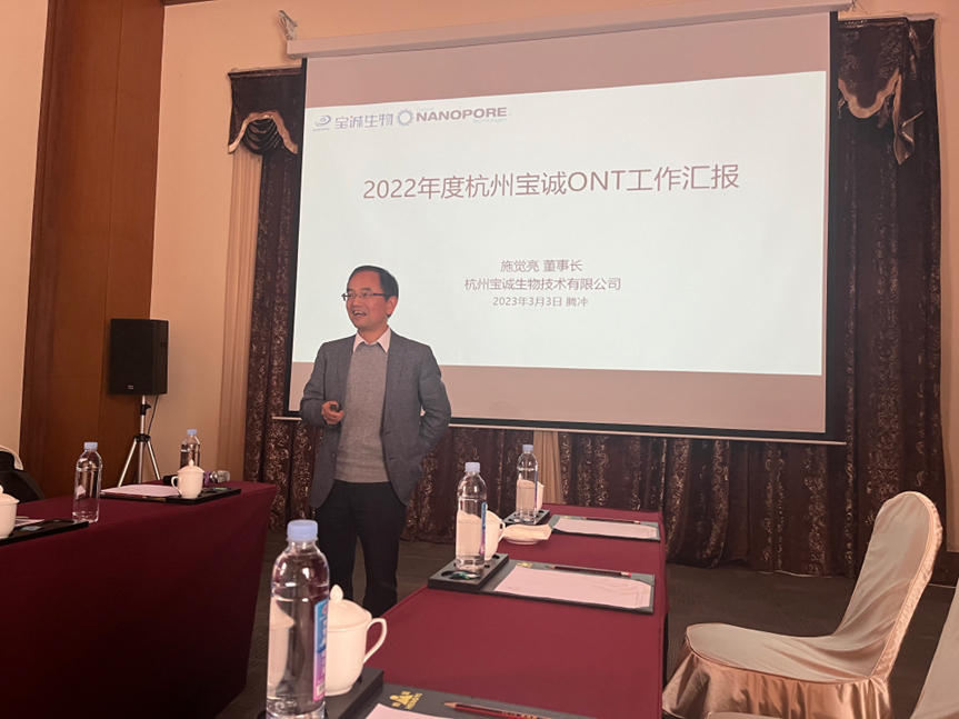 Oxford Nanopore Technologies以及代理商參會人員合影本次經(jīng)銷商大會上,我司總經(jīng)理施覺亮先生應(yīng)邀做主題“2022年度杭州寶誠ONT工作匯報”的的總結(jié)報告。報告中,施總從疫情三年寶誠人一直在一線支持用戶用納米孔測序技術(shù)開展新冠測序詮釋了寶誠在新冠疫情當(dāng)中敢為人先的企業(yè)責(zé)任,分享了通過“專業(yè)服務(wù)于專業(yè),技術(shù)服務(wù)于技術(shù)”的態(tài)度,精耕細作,推進納米孔測序技術(shù)在浙江、江蘇、福建、湖北、江西、安徽的快速發(fā)展,最終成為全國翹楚的成功經(jīng)驗。施總的精彩報告引起現(xiàn)場全體同行強烈共鳴。